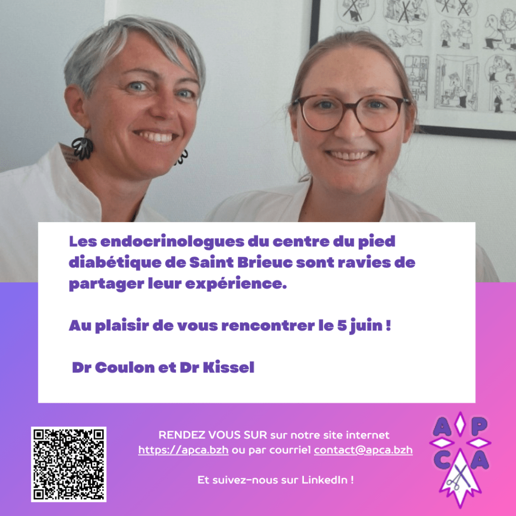 Nous avons le plaisir d’accueillir le jeudi 5 juin les endocrinologues du centre du pied diabétique de Saint-Brieuc, le Dr Coulon et le Dr Kissel, qui viendront partager leur expérience et leur expertise sur la prise en charge des plaies.